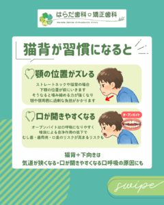 【猫背+下向き】は気道が狭くなる・口が開きやすくなる口呼吸の原因にも😱