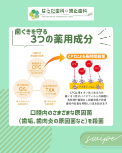殺菌成分。原因菌を殺菌し、歯垢の付着を防ぐ。